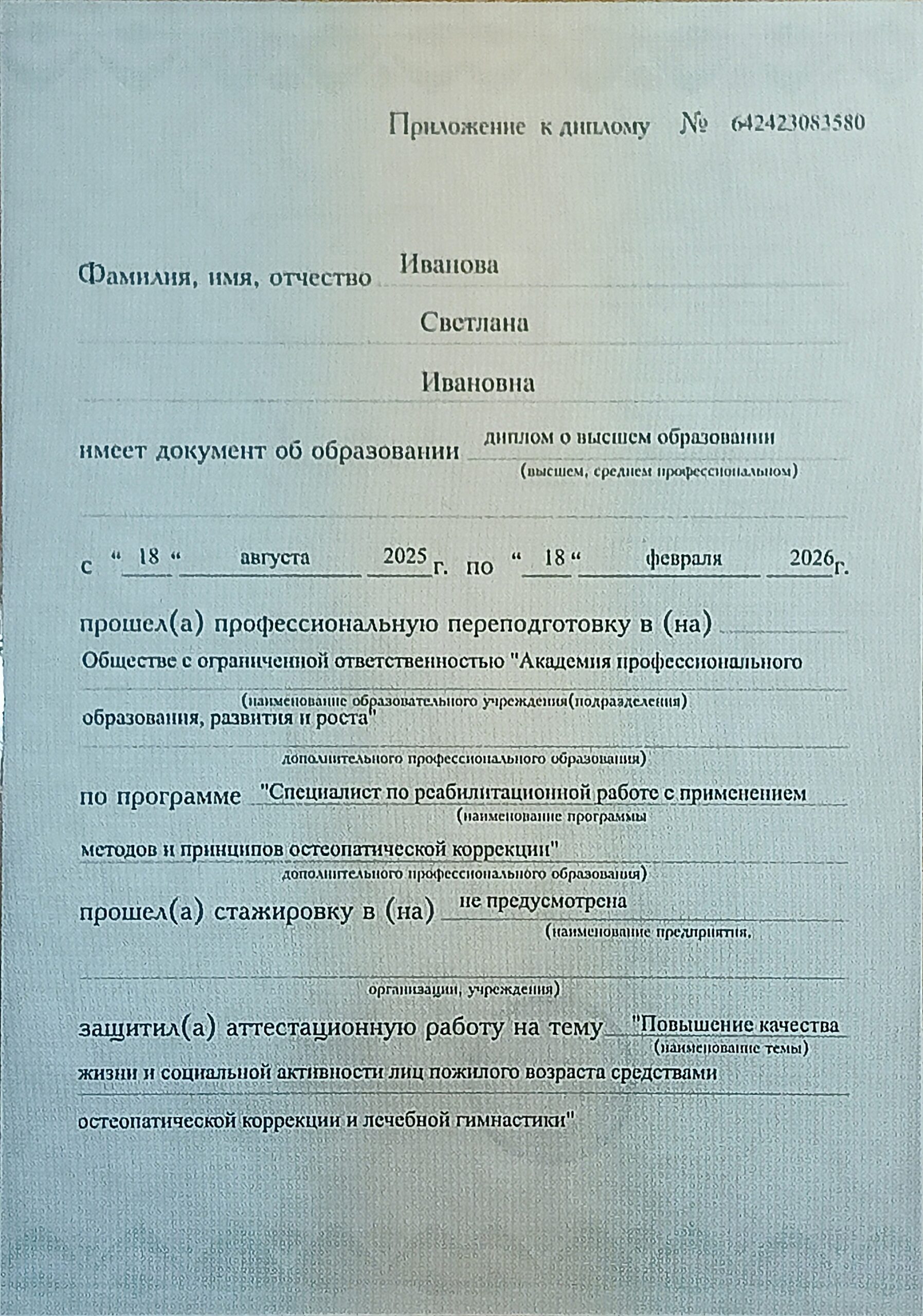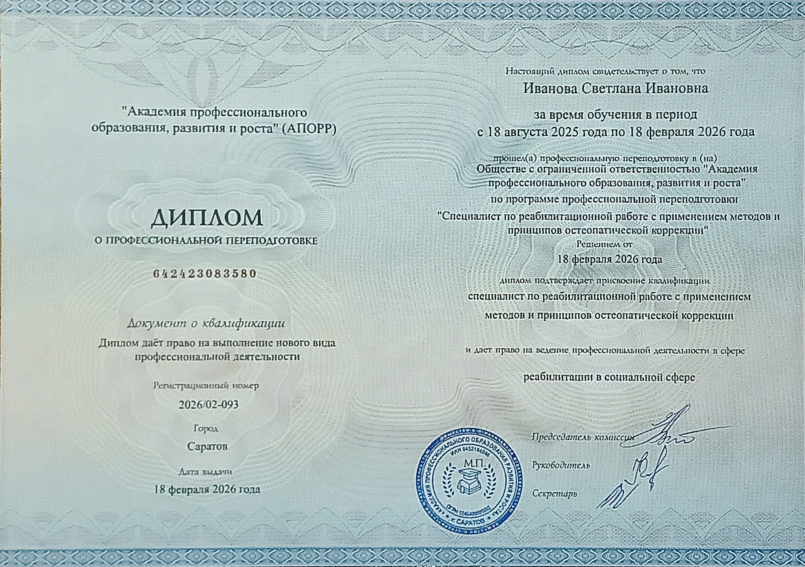 В случае успешного освоения программы и прохождения итоговой аттестации Вы получаете диплом о профессиональной переподготовке установленного образца, который даёт право на ведение профессиональной деятельности.